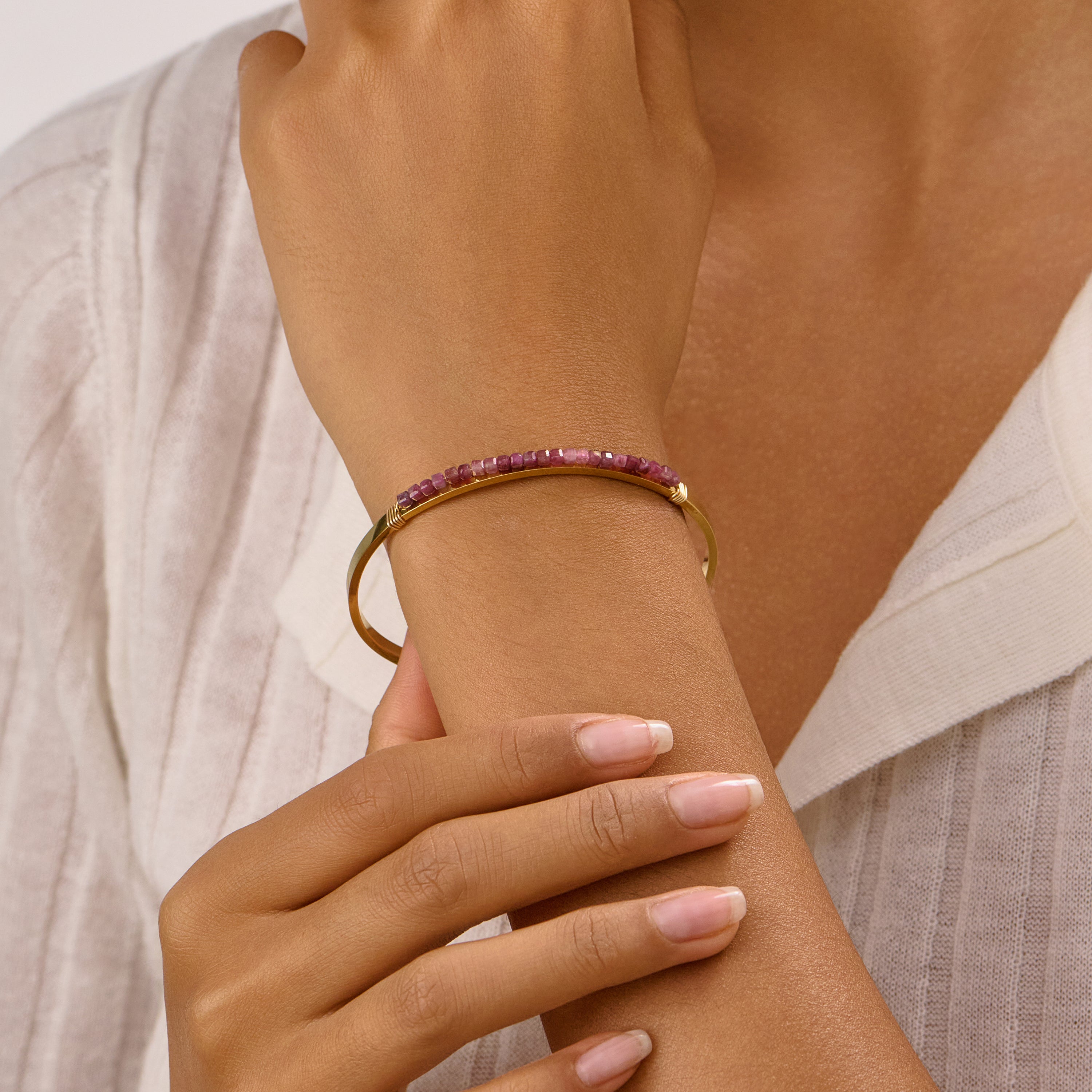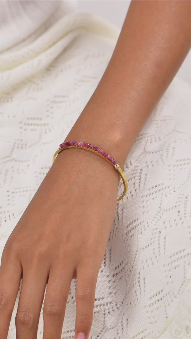 Bu zarif el yapımı bileklik, paslanmaz çelikten üretilmiş olup, üzerinde Turmalin doğal taşları ve değerli taşlar bulunmaktadır. Tasarım, pirinç tel ile güçlendirilmiş ve 18 ayar gerçek vakum kaplama ile tamamlanmıştır. Dayanıklı ve estetik bir görünüme sahiptir.